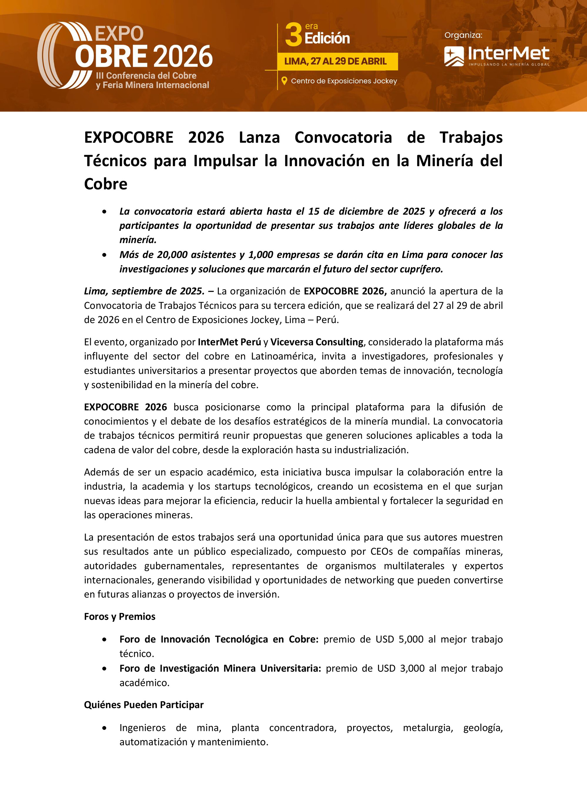 Este año, EXPOCOBRE lanza su Convocatoria de Trabajos Técnicos, abierta hasta el 15 de diciembre de 2025, invitando a investigadores, profesionales y estudiantes a presentar proyectos enfocados en la innovación, tecnología y sostenibilidad en la minería del cobre. La convocatoria permitirá a los participantes mostrar sus propuestas ante líderes globales del sector y tendrá dos foros destacados: Innovación Tecnológica en Cobre y Investigación Universitaria, con premios de USD 5,000 y USD 3,000, respectivamente.